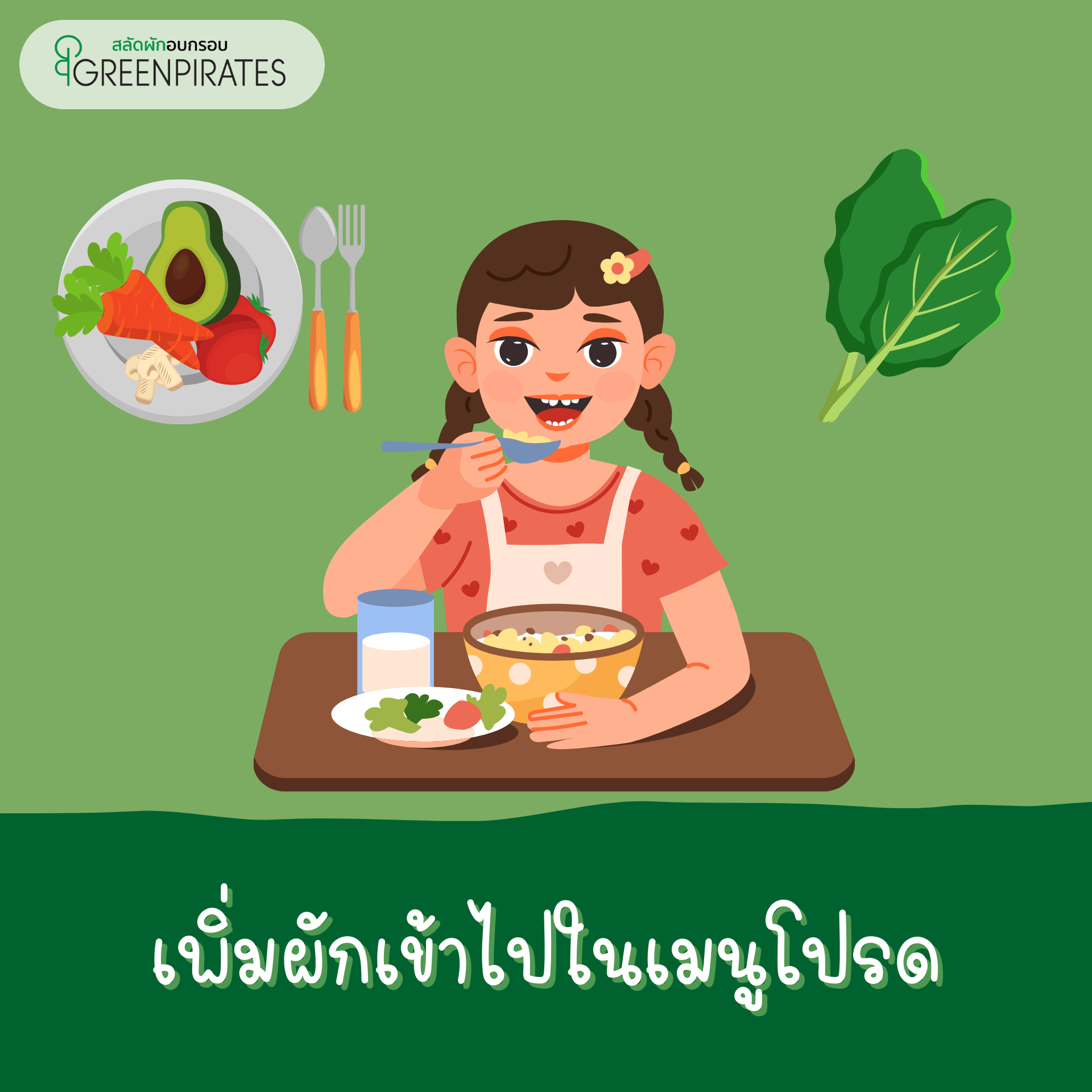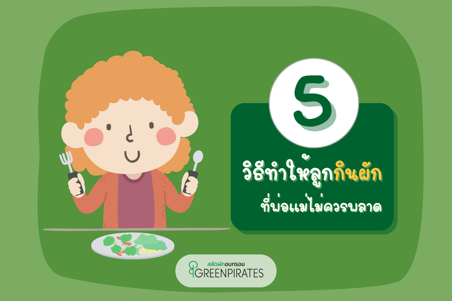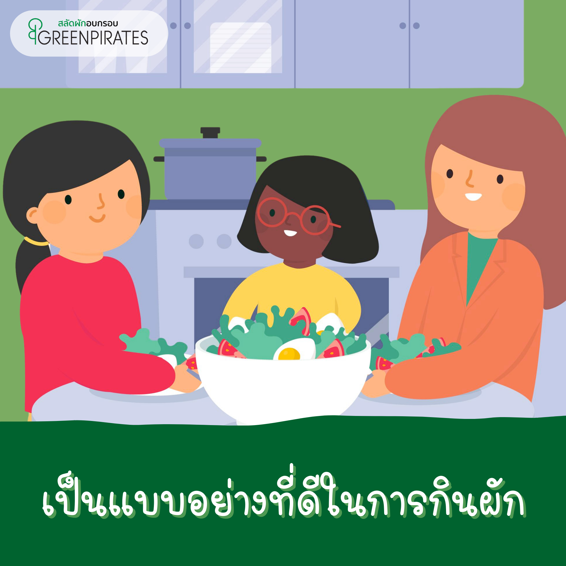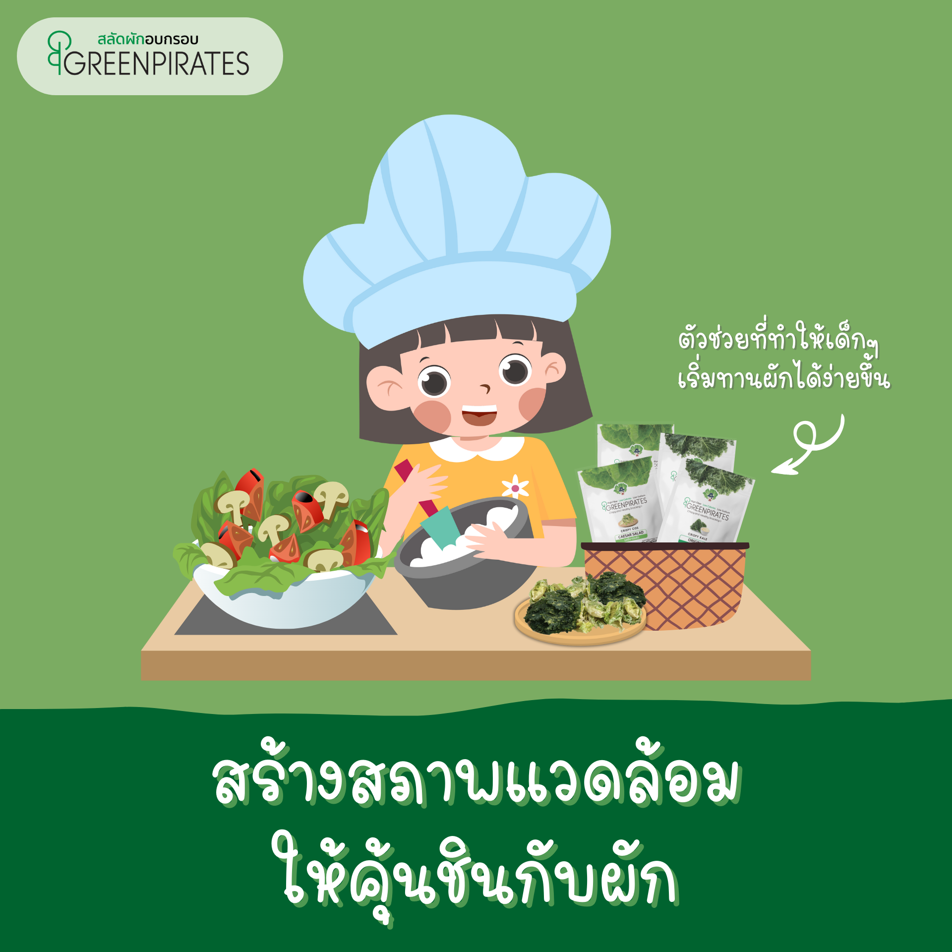 การทำให้เมนูผักเดิมๆให้น่ากินก็เป็นอีกวิธีที่ทำให้ลูกอยากลองกินผักเช่น ผักชุบแป้งทอดหรือเริ่มจากผักอบกรอบให้ลูกได้คุ้นชินกับผักโดยอาจใช้ผักอบกรอบทานระหว่างมื้ออาหารหรือแม้แต่การนำผักอบกรอบมาทำเป็นอาหารว่างคุณพ่อคุณแม่สามารถทำผักอบกรอบเองได้ง่ายๆที่บ้าน แต่หากบ้านไหนไม่สะดวกทำเอง ในบทความนี้เราขอแนะนำสลัดผักอบกรอบ GreenPirates สลัดผักที่มาในรูปแบบของผักเต็มใบที่จะช่วยสร้างความคุ้นชินให้กับลูกได้ บรรจุอยู่ในซองพร้อมทานพกพาสะดวก ที่สำคัญสลัดผักอบกรอบ GreenPirates เราไม่ใส่ผงชูรส ไม่ใส่วัตถุกันเสีย ไม่มีสารแต่งกลิ่นและเจือสีสังเคราะห์ เราใช้วิธีการอบให้กรอบในอุณหภูมิต่ำเพื่อให้คงคุณค่าทางสารอาหารให้ได้มากที่สุด หากคุณพ่อคุณแม่ท่านไหนกำลังมองหาเมนูผักที่จะนำมาเป็นจุดเริ่มต้นให้ลูกได้ฝึกกินผักลอง สลัดผักอบกรอบ GreenPirates ดูสิคะ