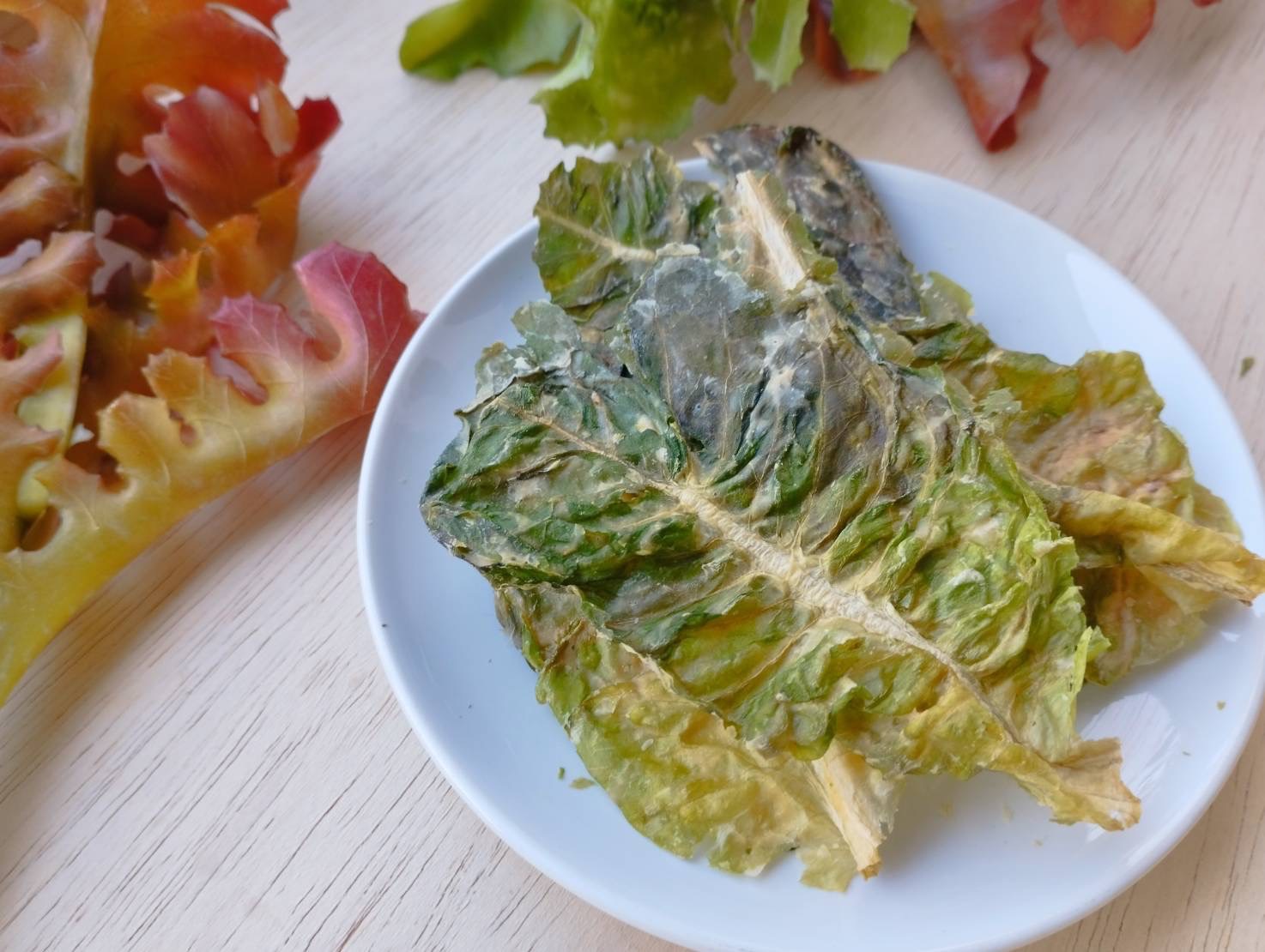 Vegetable Characteristics: In Crispy Salad, whole leafy greens are used, while regular vegetable chips typically do not use leafy greens. Instead, they often use thicker vegetables, fruits, or mashed and reshaped vegetables.