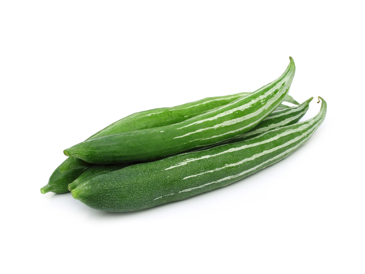 It resembles a snake, having a long, slender, curved, and twisted shape with a pointed end. The skin is thin, smooth, and green with white longitudinal stripes and a slight sliminess. The flesh of the snake gourd is soft and watery, with a mildly bitter taste.