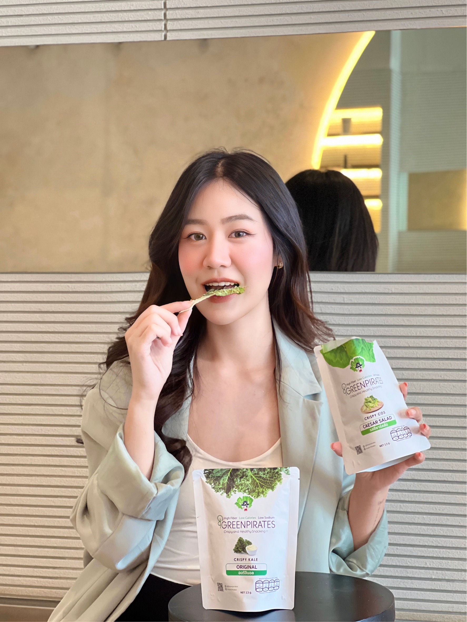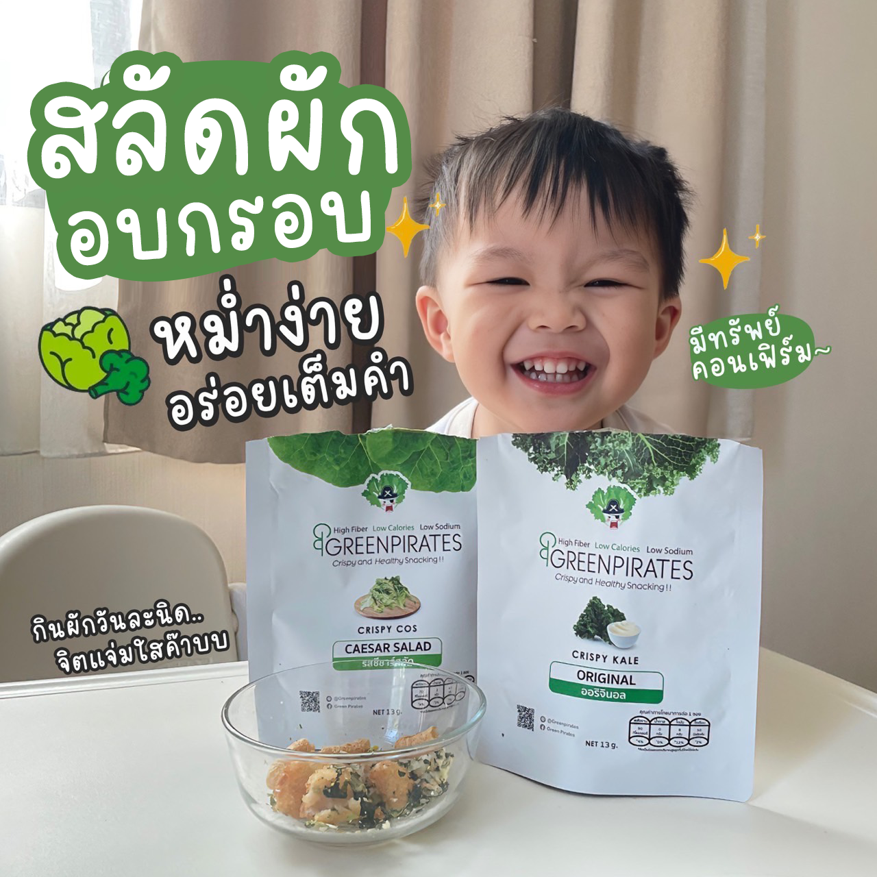 สลัดผักอบกรอบ GreenPirates ทางเลือกใหม่สำหรับคนที่ต้องการกินผักหรือสลัดผักในรูปแบบใหม่ที่ไม่ซ้ำซากจำเจ สลัดผักในรูปแบบซองพร้อมทาน เราได้คัดสรรผักจากแหล่งปลูกที่ได้มาตรฐาน ปราศจากยาฆ่าแมลง นำมาคลุกเคล้ากับน้ำสลัดสูตรพิเศษที่ให้รสชาติหอมกลมกล่อม ทานง่าย ไม่ขมและไม่มีกลิ่นเหม็นเขียว แล้วนำไปอบในอุณหภูมิต่ำเพื่อคงคุณค่าทางสารอาหารให้ได้มากที่สุด จนได้มาเป็นสลัดผักอบกรอบที่ทั้งอร่อยและดีต่อสุขภาพ พร้อมให้คุณพกไปทานได้ทุกที่ ทุกเวลา